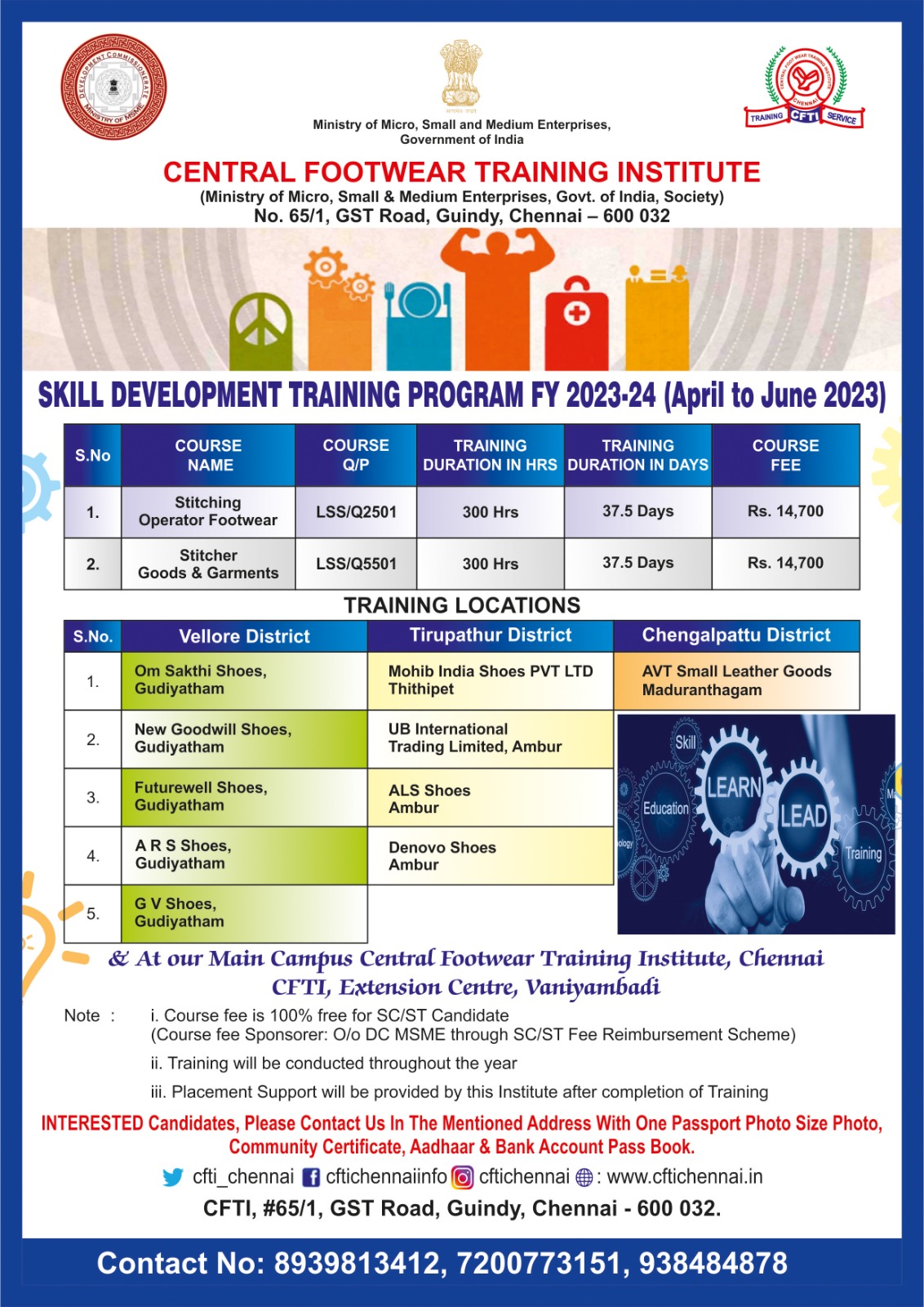 CFTI Chennai, as a training partner, is conducting a short-term skill training program for 1805 candidates for FY 2022-23 and 2023-24, titled ‘Placement-linked Entry-level Training for Unemployed Youth,’ sponsored by the Tamil Nadu Skill Development Corporation under the TNSDC Green Channel.